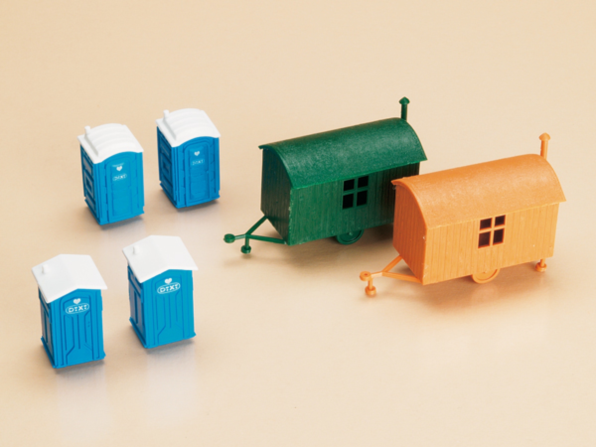 Inhalt: 2 Bauwagen 53 x 20 x 30 mm, 4 Mobiltoiletten 14 x 14 x 27 mm.