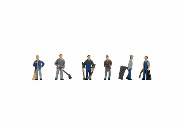 Das Set enthält sechs handbemalte Figuren aus Kunststoff. Die Figuren tragen die für Hausmeister typische Arbeitskleidung und führen verschiedene Tätigkeiten aus. Ein Arbeiter sammelt den Müll auf, ein weiterer zieht eine Mülltonne, weitere Hausmeister hantieren mit Schaufel und Besen.